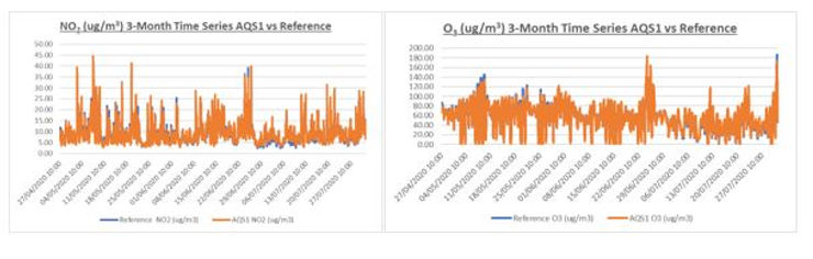 The regression plots below show how the AQS1 agreed with the Reference analysers over the three months of the trial. Nitrogen Dioxide levels were unusually low during this period resulting in a lower R2 value for NO2 but correlation at the 40ug/m3 annual limit was excellent. Ozone levels were much higher at times and shows even better correlation, although this is mainly due to Aeroqual’s unique ozone measurement technology.