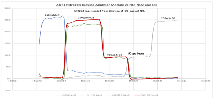 NO2 (Nitrogen Dioxide) was generated by mixing NO (Nitric Oxide) with O3 (Ozone) in a balance of zero air. In the test below calibration gases were fed to both the AQS1 and an MCERTS reference chemiluminescent NOx analyser. Gases were also fed to a reference. To start with NO from a certified high concentration gas standard cylinder was first diluted with zero scrubbed ambient air to create a 250 ppb standard. Neither analyser responded. The ozonater was then switched on and titrated with the NO to create an NO2 250 ppb standard. The same was then used to generate a 90 ppb standard. The NO was then switched off and the analysers tested at 90 and 250 ppb. The results are shown below.
