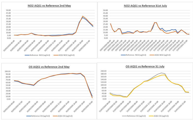 From April to July 2020 an AQS1 was operated close to our reference chemiluminescent NOx analyser (see figure 1). Neither instrument was adjusted during this period, so it has not been possible to apportion drift between the two instruments. However, the data does show just how closely the two analysers tracked each other over a period of more than three months without calibration or adjustment.