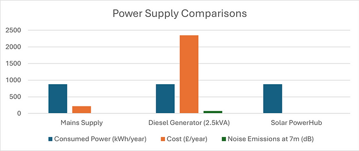 • Environmental Impact: Solar power and battery systems offer a zero-emission solution, making them the best choice for sustainability. Mains supply has minimal emissions, whereas diesel generators produce high CO2 emissions.