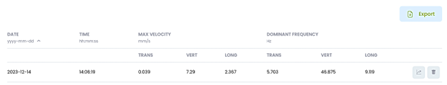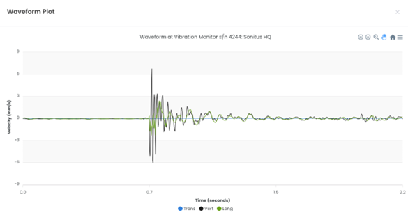 The Sonitus Cloud platform captures velocity data in mm/s for each channel, enabling detailed analysis of vibration events: