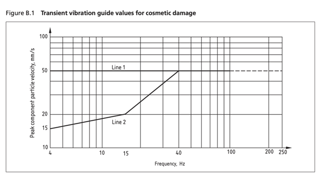 In the table you will see at 4Hz the vibration limit is 15mm/s for cosmetic damage right up to 50mm/s at 40Hz.