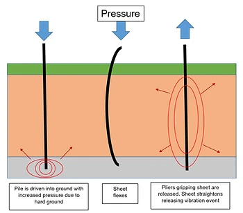 In the press in method varying pressure is applied to the pile.  Where there is hard ground the pressure is increased and this can cause the sheet to flex.  When the plier gripping the sheet is released the sheet straightens releasing energy as a transient vibration event.  This is illustrated in figure 4 below.
